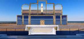 - - - - - - - - - - - - - - - - - - - - - - 2024-03-14 | [This text should be read in francais] | Sur la digue, avec vue sur « Le bout du Monde », et un horizon tourné vers le port du Havre et l’avenir, ma tête n’est plus qu’un container tout plein d’images et d’humeurs vagabondes. En ces temps de grands bouleversements, on dit même que depuis quelques décennies, Saint Quentin et Saint Regnobert de La Côte de Nacre se retournent… Comme des panneaux à l'entrée ou à la sortie de nos communes et villages. C’est le monde à l'envers, ou plus exactement, une version de Stranger Things en temps réel. « Miserere !» dirait ma grand-mère de Luc J’ai beau régler mes fréquences sur celle du Petit-Enfer,(1) l’appel des écrans brouille le paternoster et mes bénédicités. Heureusement, c’est l’appel de la Mer qui est le plus fort et qui l’emporte toujours. En ces temps de changements tous azimuts, de mutations sociales et culturelles, et de transformations profondes de nos horizons… En ces temps où les Icônes sur nos smartphones, tablettes et bureaux d’ordinateur ont remplacé les icônes dans les églises. Ces temps pleins d’incertitudes et de zones d’ombre, où la bénédiction des bateaux et des marins avec messe sur la mer a laissé place aux messes mondaines, cérémonies, oscars et autres bénédictions sur écrans panoramiques. Où les SDF des villes et des champs ont échangé leurs grabats avec les gisants de nos églises. Où la Star Académie et The Voice couvrent les voix des vagues et les chœurs de cathédrales. Où les jetables ont pris la place des retables d’hier. Où les apparitions de madone se font télévisuelles ou par hologrammes. Où les tabernacles ont des codes PIN et des mots de passe comme des distributeurs de billets. Où tous nos objets cultuels sont connectés au Grand Cloud. Où les Pèlerinages se transforment en parades, et les processions en complexes processus pour microprocesseurs. Où la Passion, ses stations et son chemin de croix se jouent sur un échiquier mondialisé. Où le bonheur est livré par et sur Amazone ou se livre sur Instagram et Pinterest. Où l’Intelligence dite Artificielle nous protège de nos intelligences artificieuses tout en préparant une Conscience Artificielle. Où la carte à puce prépare nos implants. Où le wifi et autre Bluetooth nous cuisent la mémoire comme des œufs brouillés. Où la joie et la paix se téléchargent sur des Torrents. Où la litanie des téléréalités participe à de toutes nouvelles liturgies. Où les mots de passe ont remplacé nos anciens maux de passage. Où la peur a succédé à l'espérance. Où nos rituels en réalité augmentée commémorent la haute technologie. Où l’on se prosterne plus que jamais devant le pouvoir, les avoirs, le savoir, ou par devoir. Où la liberté et le libre arbitre se comptent en bitcoin ou autre argent virtuel. Où nos amis sur Facebook se font plus proches que nos proches. Où l’on implore l’Euro million et le Loto du haut de nos prix dieux. Où les Angélus et les Démons sont devenus des héros pour Netflix. Où la fête de Noël se fait Halloween et Quasimodo un héros pour plateformes. Où les données mobiles mobilisent tous nos sens. Où l’Ascension pour Mars prime sur l’élévation des consciences. Où les Évangiles se livrent clé sur porte en PDF. Où les cultes politiques, sportifs et artistiques prônent « Le Système » (...) En guise de litanies, il me semblait nécessaire de faire un tour de digue pour respirer un peu, et de marcher jusqu’au pied des falaises des Confessionnaux de Luc. Là même où se font entendre les rumeurs du monde entremêlées à l’écho des grandes marées. Et après avoir enfilé une étole de varech sur une aube d’écume, avec en main un chapelet de coquillage, je me tourne avec attention, respect et intention vers l’Étoile de la Mer… Quand les Anges et les mouettes se battent dans un conflit de territoire ; que le réel est les mirages se font virtuel, et que les miracles se font uniquement numériques ; de profundis, des abysses et des nuées, je crie. C'est pourquoi, en ces temps de grands bouleversements, il me semblait approprié de dresser au Petit-Enfer sur le maître-autel de la mer, ce polyptyque, comme un mémorial, pour nous souvenir d’où nous venons et où nous allons exactement ; livrant ainsi aux quatre vents ce retable peint de ciel, de mer et de plage, comme un triptyque augmenté, ou comme la peinture d’un primitif normand ou d’un lutin (habitant de Luc-sur-Mer) quelque peu inquiet de notre avenir à tous. (1) Lieu-dit à Luc-sur-Mer (Calvados - France)