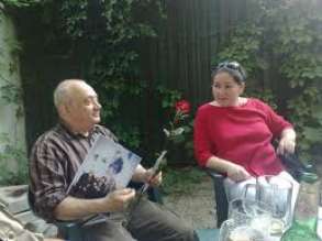 Să lăsăm vedenia în pliscul păsării ciugulind clopotul mut al călăului. Să dăm cu banul și să punem pariu pe căderea în semne a omului rotitor. Vedeți dumneavoastră, imediat vă trece prin gând o linie, imediat altoiți mărului creanga cea nouă, creanga din care se naște scorbura unei idei. Nu vă lăsați în lacrima zilei ci porunciți de grabă să fie adus în cetate artistul. Puneți imediat un premiu pe limba lui, pe inima lui - pe mâinile lui, nu. Adunați sub Sreașina Domnului zugravi, poeți, cântăreți chemați paharnicul, rostiți pe de rost rugăciunea și strigați ca din gură de șarpe să fie adus în cetate vinovatul de rezervă - acela ce încă mai lasă din inima lui o pasăre să plece acasă. De găsiți potrivit faceți vă rog nod acestei distanțe și rostiți cu blândețe numele... Mircia Dumitrescu Căutați târziului biserica cea mai aproape - vine Domnul să facă prezența! Iată l-am șoptit în taina sfintei distanțe pe marele grafician român Mircia Dumitrescu foto: florian silișteanu grădina de vară a muzeului literaturii române prin vara anului 2011 în fotografie se află alături de marele artist și soția dumnealui au apărut în Colecția: poetul florian silisteanu si portretul sfintei distanțe 1 poetul paul vinicius 2 poeta anca mizumschi 3 omul de televiziune christian sabbagh 4 președintele româniei traian băsescu 5 președintele partidului românia mare corneliu vadim tudor 6 marele grafician mircia dumitrescu