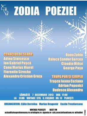 - - - - - - - - - - - - - - - - - - - - - - 2013-11-29 | | Călin Derzelea, Marian Dragomir și Costin Trestioreanu alături de ASOCIAȚIA ADSUM vă invită la a doua ediție a ZODIEI POEZIEI, sâmbăta, 7 decembrie 2013. Evenimentul va avea loc la Club Vintage (Str. George Cosbuc, nr.13 – colț cu str. Constantei), începând cu ora 17:00. Participă membrii „Cenaclului de seară”: Adina Stoicescu, Ion Gabriel Pușcă, Conu Marius Viorel, Florentin Streche și Alexandru Cristian Groza. Ploieștiul este reprezentat de poeții: Oana Zahiu, Raluca Șandor Gorcea, Claudia Mihai și George Pașa. Trupa „Pur și simplu” (Trașcu Ioana Coziana, Adrian Popovici și Dudescu Alexandru) ne va încânta cu acorduri folk. ![]()