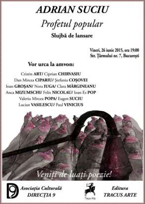 - - - - - - - - - - - - - - - - - - - - - - 2015-06-22 | | Vineri, 26 iunie 2015, ora 19.00, pe Strada Țărmului, nr. 7, Asociația Culturală Direcția 9 și Editura Tracus Arte vă invită la un spectacol de poezie contemporană prilejuit de lansarea volumului de poezie ”Profetul popular”, de Adrian SUCIU. Alături de autor, vor urca pe scenă scriitorii: Ciprian CHIRVASIU, Dan Mircea CIPARIU, Ștefania COȘOVEI, Ioan GROȘAN, Nora IUGA, Clara MÃRGINEANU, Anca MIZUMSCHI, Felix NICOLAU, Ioan Es POP, Valeriu Mircea POPA, Eugen SUCIU, Lucian VASILESCU și Paul VINICIUS. Numeroase alte surprize poetice au fost pregătite pentru publicul prezent la lansarea ”Profetului popular”. Intrarea este liberă. Adrian Suciu s-a născut la 21 decembrie 1970, în Năsăud. Absolvent de Litere la Cluj și de tot felul de cursuri, școli si stagii postuniversitare și de perfecționare prin țară și peste granițe. De-a lungul vremii, într-o poeticească succesiune, a schimbat tot felul de meserii și funcțiuni încercînd să performeze în fiecare dintre ele, cu bănuiala că din literatură nu se poate trăi decît prost: miner, electrician, bișnițar, profesor, ziarist, tehnician maseur, consilier de imagine, funcționar parlamentar, funcționar guvernamental. Evident, lista va continua. Cărți publicate: “E toamnă printre femei și în lume”, versuri, Editura Echinox, Cluj, 1993; “Singur”, versuri, Editura Euphorion, Sibiu, 1996; “Nopți și zile”, versuri, Editura Arhipelag, Târgu Mureș, 1999; “Din anii cu secetă”, versuri, Editura Grinta, Cluj, 2005; “Sex cu femei”, roman, Editura Tritonic, București, 2008; “Viața fără urmări”, versuri, Editura Brumar, Timișoara, 2010; “Mitologii amînate”, versuri, Editura Herg Benet, București, 2011; “Un roman de rahat”, roman, Editura Tritonic, București, 2013. Prezent în numeroase antologii literare în țară și străinătate, cărora nu a fost curios să le facă o inventariere exhaustivă. Tradus în engleză, franceză, germană, italiană, maghiară, occitană, ebraică și tot felul de alte limbi. În calitate de cîștigător a tot felul de premii literare, inclusiv unele acordate de USR, ceea ce reprezintă cireașa de pe tort, cere oficial și degeaba o subvenție de la Ministerul Culturii pentru acoperirea costurilor de depozitare a nenumăratelor diplome lăsate deja prin testament statului român. În calitate de editor și președinte al Asociației Culturale Direcția 9 a publicat o grămadă de cărți de poezie mișto ale altora și a organizat tot felul de evenimente literare la care nu s-a scorojit varul pe pereți de plictiseală. Restul e istorie… ![]()